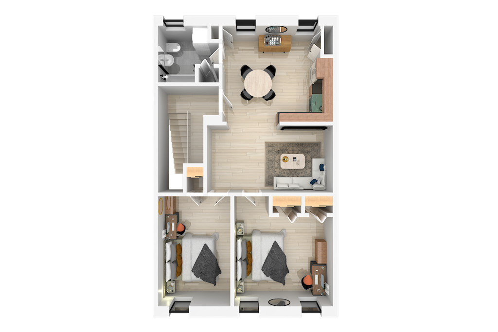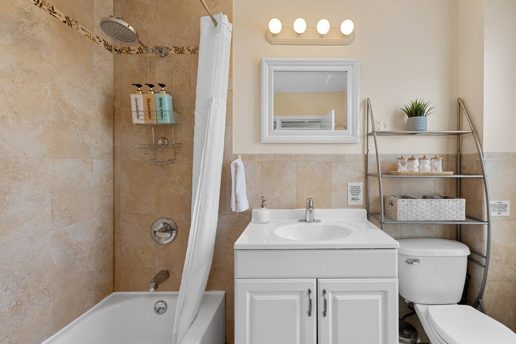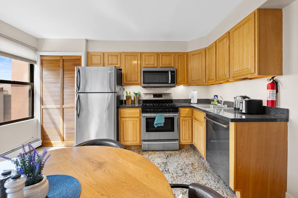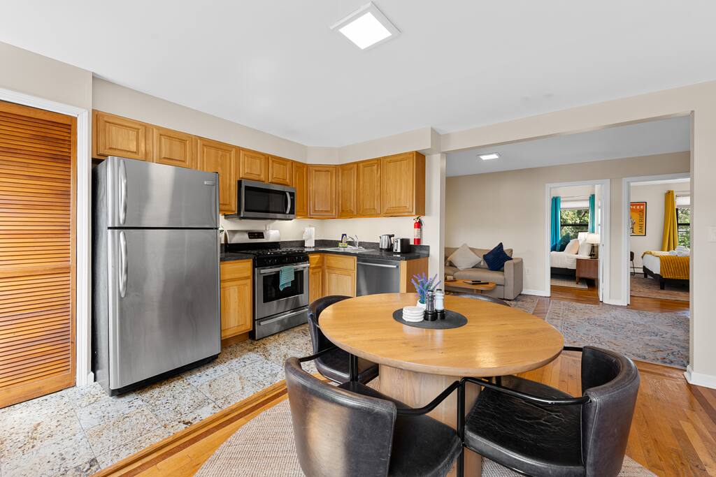 The space - 2 bedroom / 1 bathroom 4th (top) floor apartment - Both bedrooms have KING size beds - Spacious living area, south facing - Smart 55" Roku TV - High speed internet & desks in both bedrooms ideal for remote work - Full size kitchen & dining area (including microwave, refrigerator, sink, oven, stove & basic cooking amenities) - Coffee station, with complimentary starter tea & coffee - Shower/bathtub - In-unit laundry (washing machine & tumble dryer)