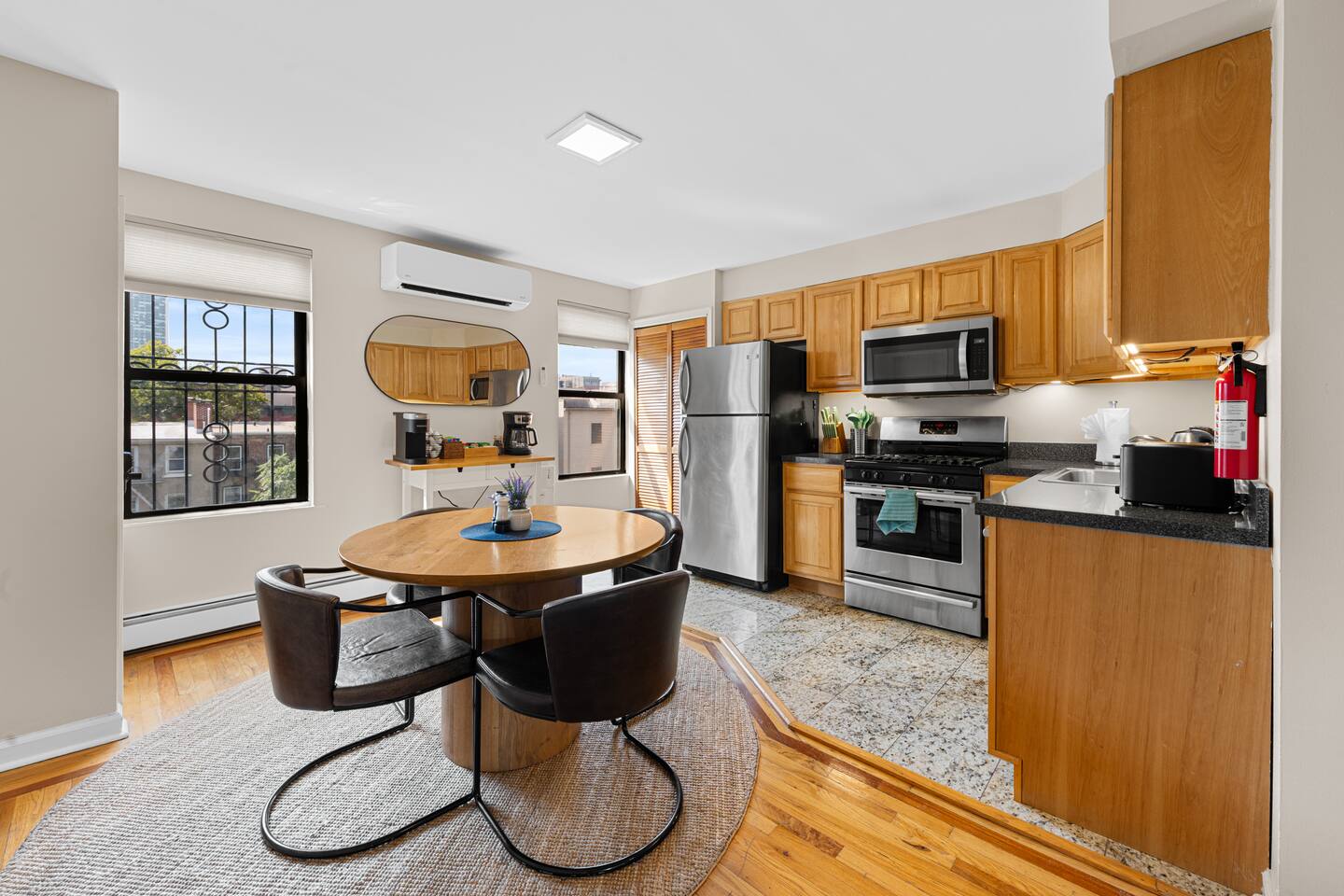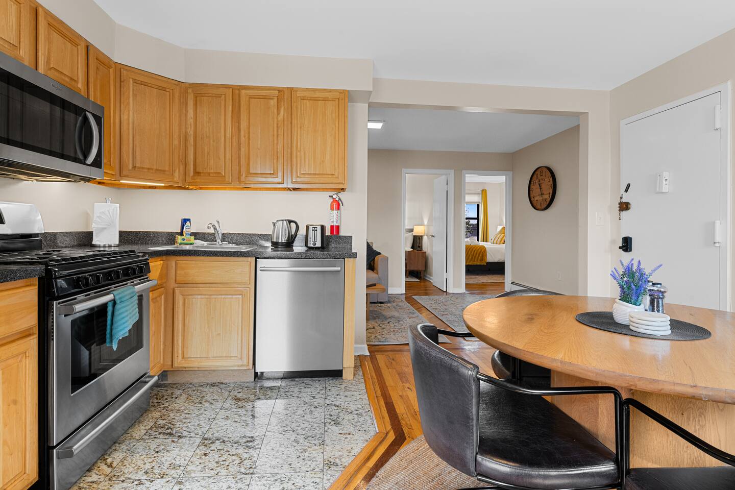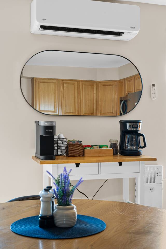 The space - 2 bedroom / 1 bathroom 4th (top) floor apartment - Both bedrooms have KING size beds - Spacious living area, south facing - Smart 55" Roku TV - High speed internet & desks in both bedrooms ideal for remote work - Full size kitchen & dining area (including microwave, refrigerator, sink, oven, stove & basic cooking amenities) - Coffee station, with complimentary starter tea & coffee - Shower/bathtub - In-unit laundry (washing machine & tumble dryer)